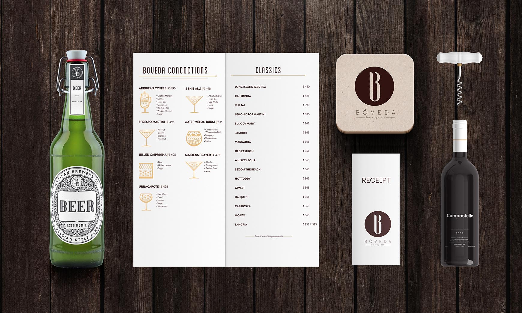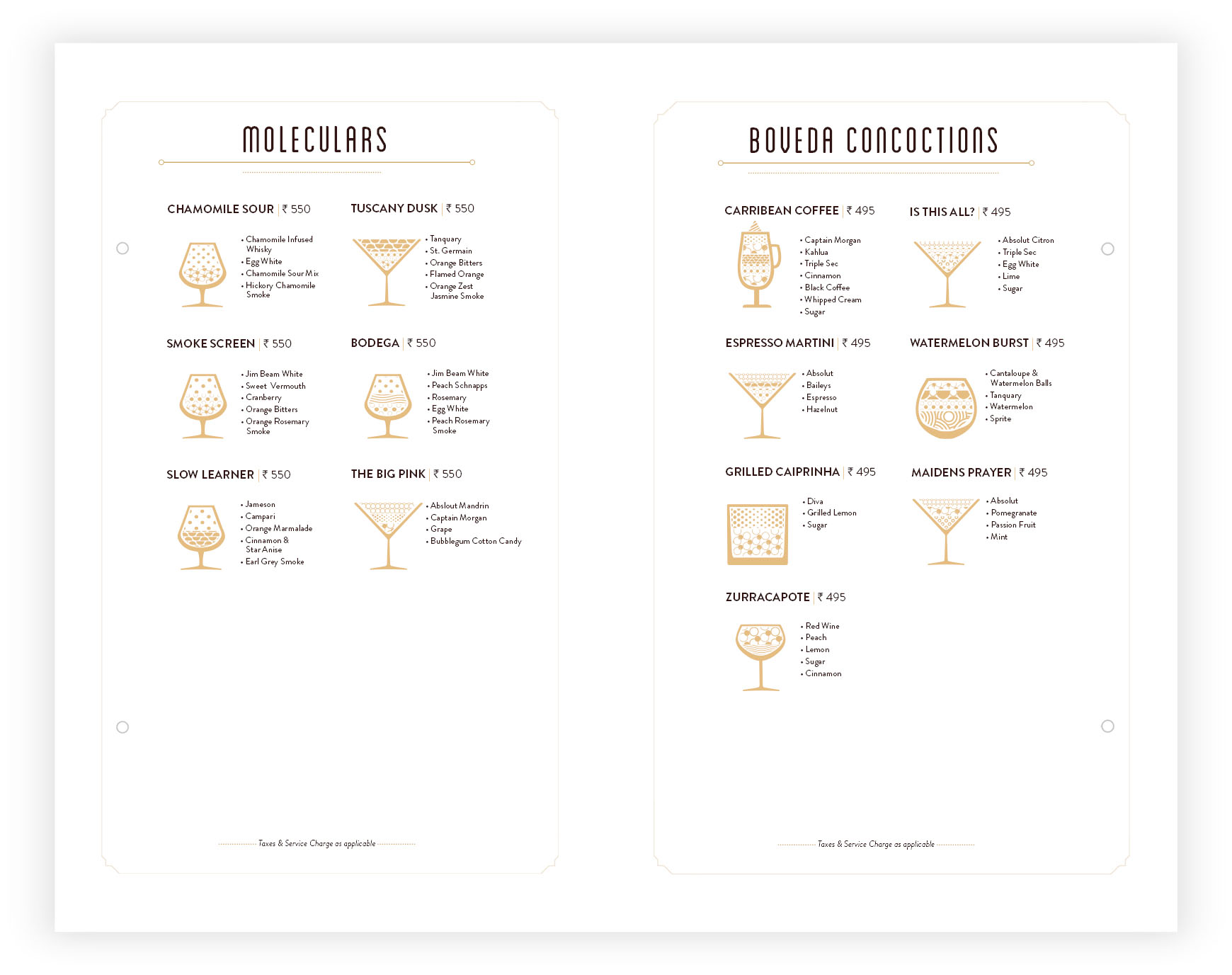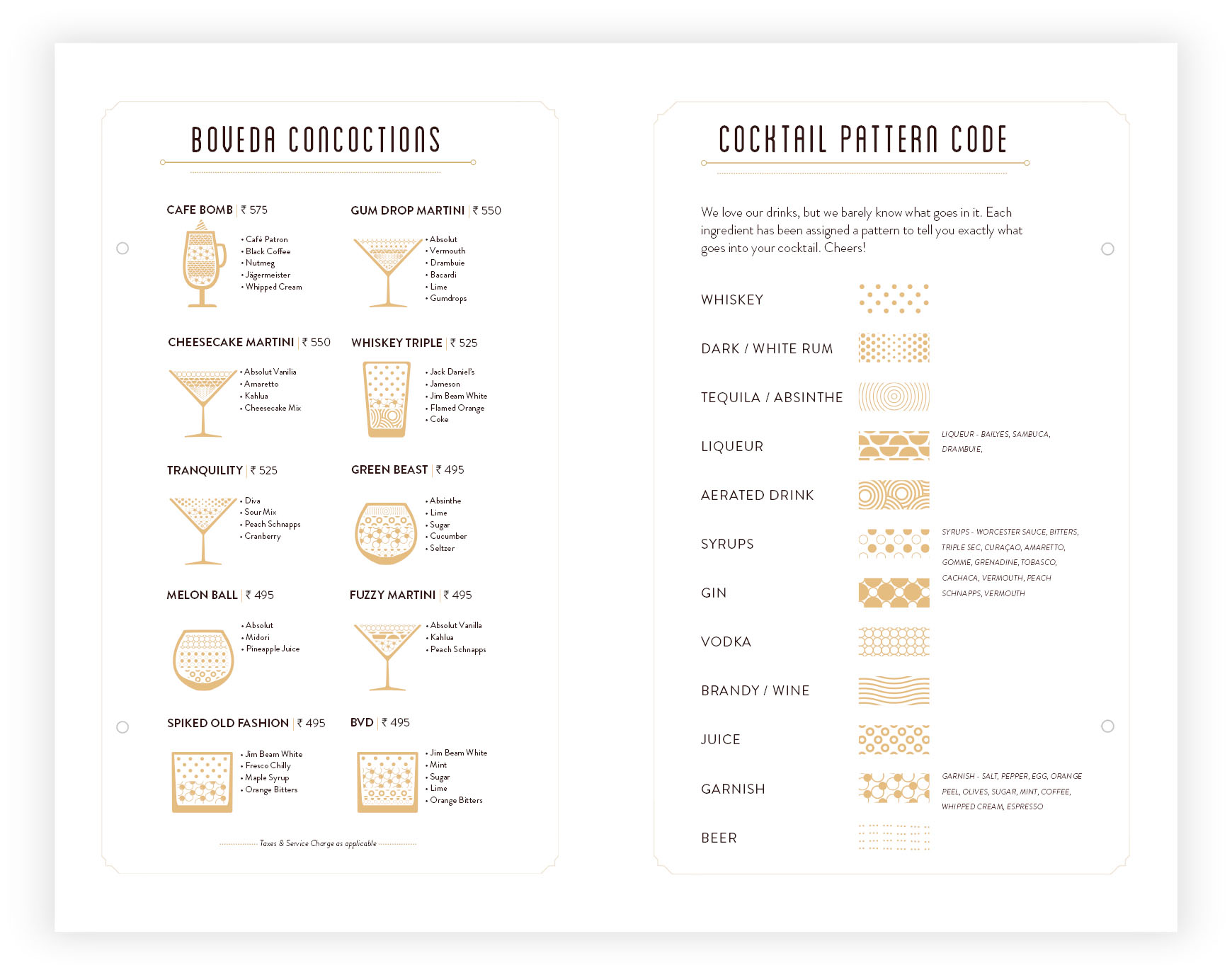 - For the bar menu, we decided to introduce new design elements that would represent different alcohol options creatively. We also decided to use the glasses in which they are usually served at the bar and how different alcohol options came together to form Boveda Concoction.