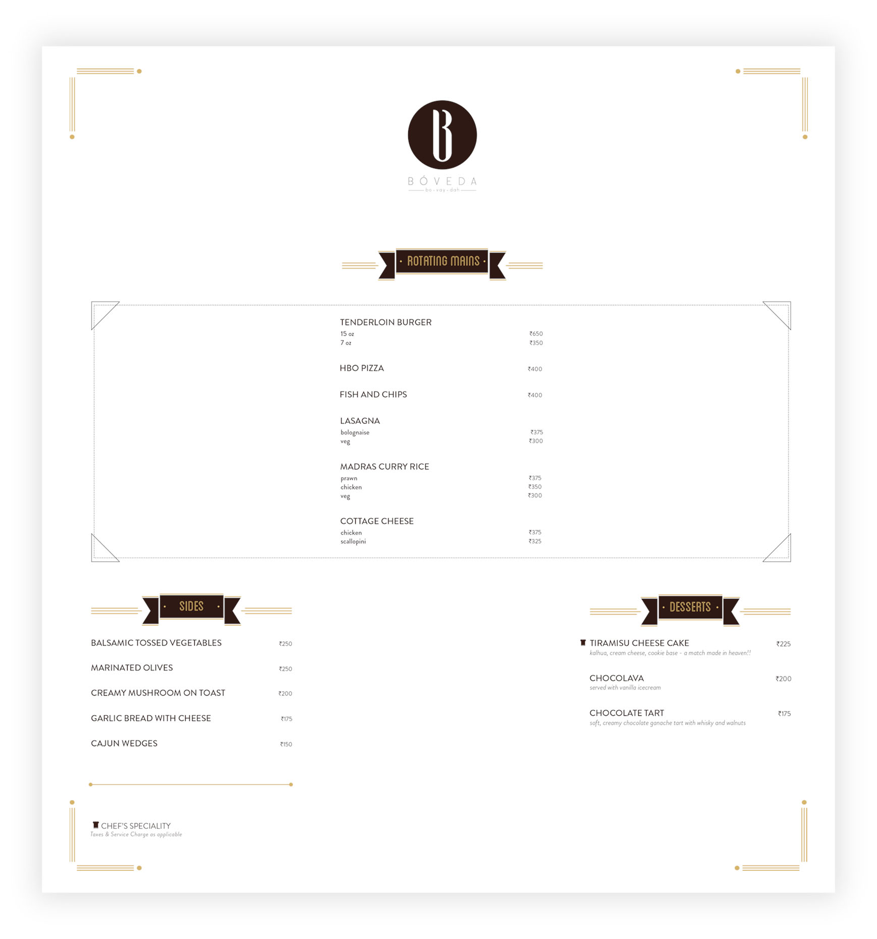 - For ‘Rotating Mains’ concept, we crafted a two sided menu. At backside of the menu, a special detachable placard area was designed to add rotating food items each week or month without having to change the menu design each time.