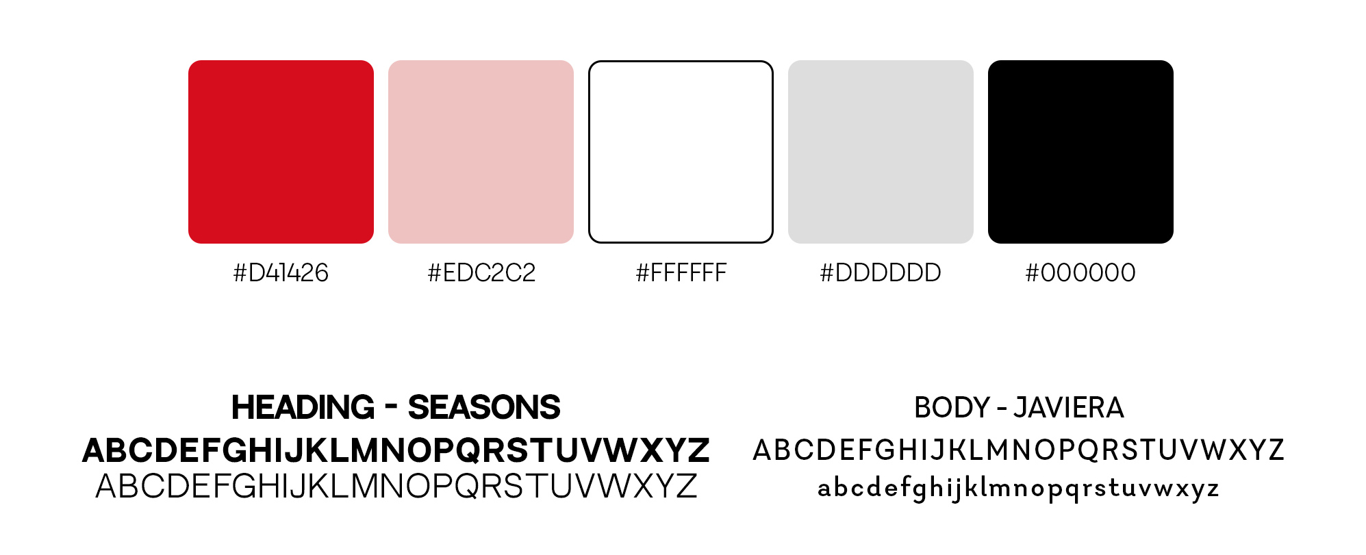 Headings use ‘Seasons’, a typeface that feels grounded but not dated. Body copy is set in ‘Javiera’, a clean, legible font that balances structure with warmth. - Colour Palette