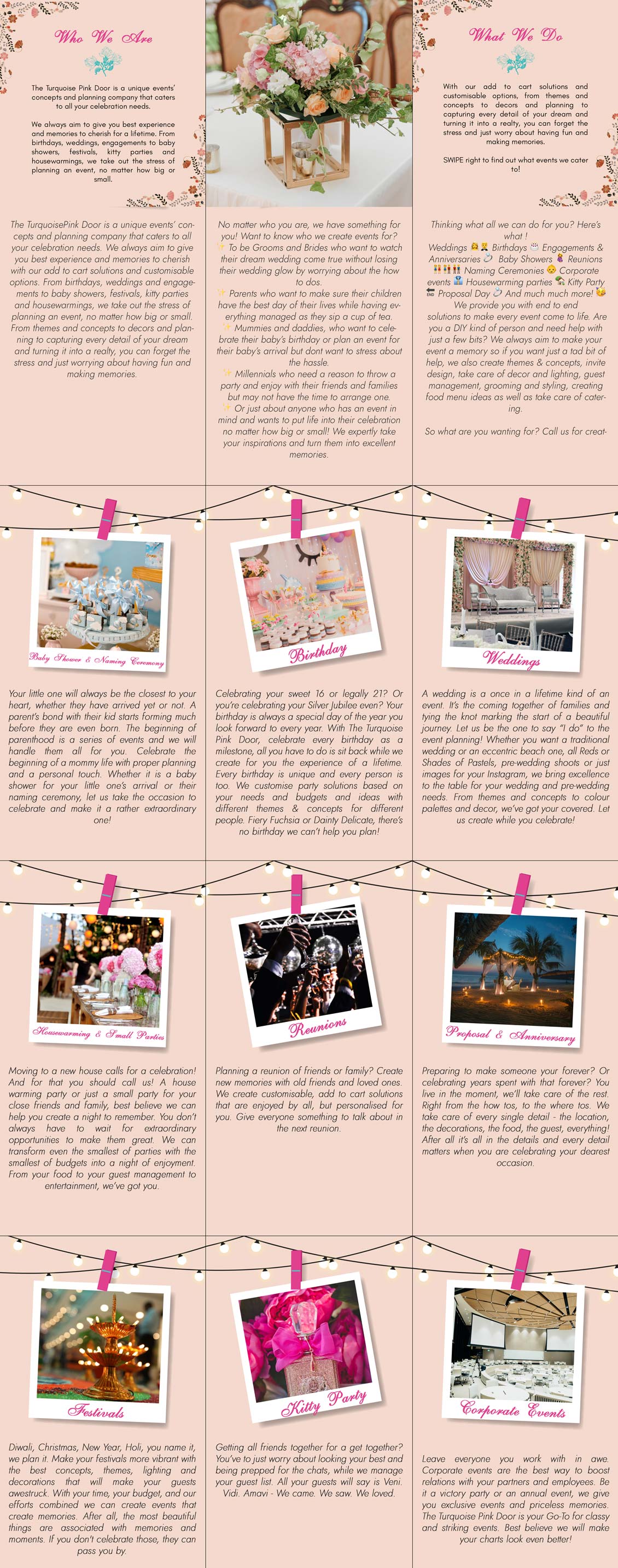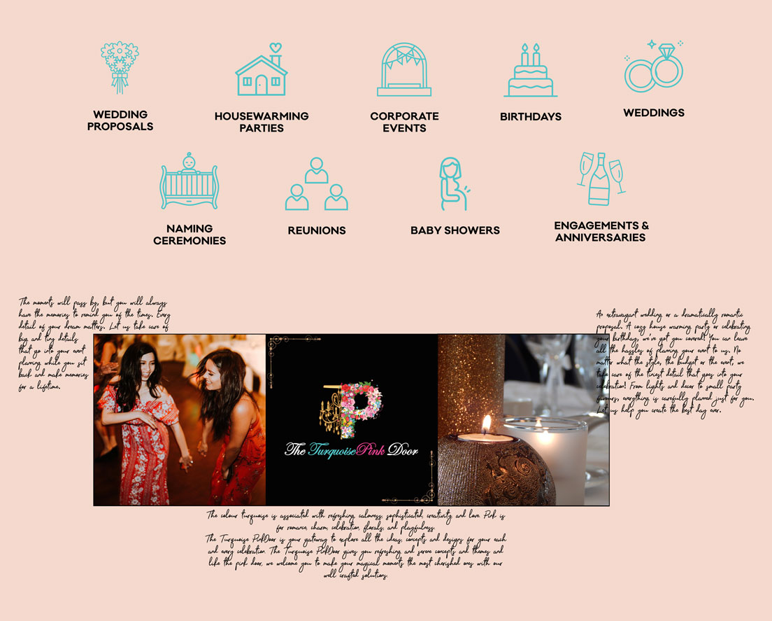 The Turquoise Pink Door is a unique events’ concepts and planning company that caters to all your celebration needs. The brand aims to give you best experience and memories to cherish with their add to cart solutions as well as customisable options. From birthdays, weddings and engagements to baby showers, festivals, kitty parties and housewarmings, they take out the stress of planning an event, no matter how big or small. From themes and concepts, decors and planning to capturing every detail of your dream and turning it into a realty, you can forget the stress and just worrying about having fun and making memories.